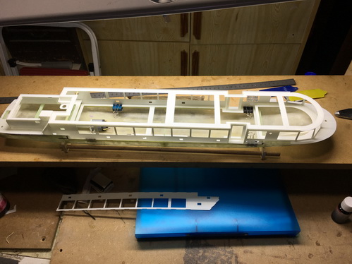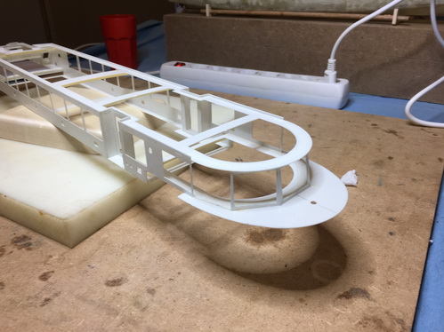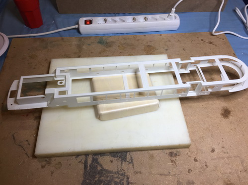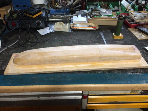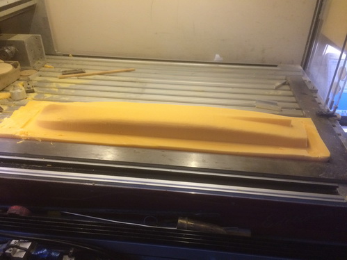 Rumpfmodell aus Schaumplatten gefräst, dann mit Matten bezogen und geschliffen. |